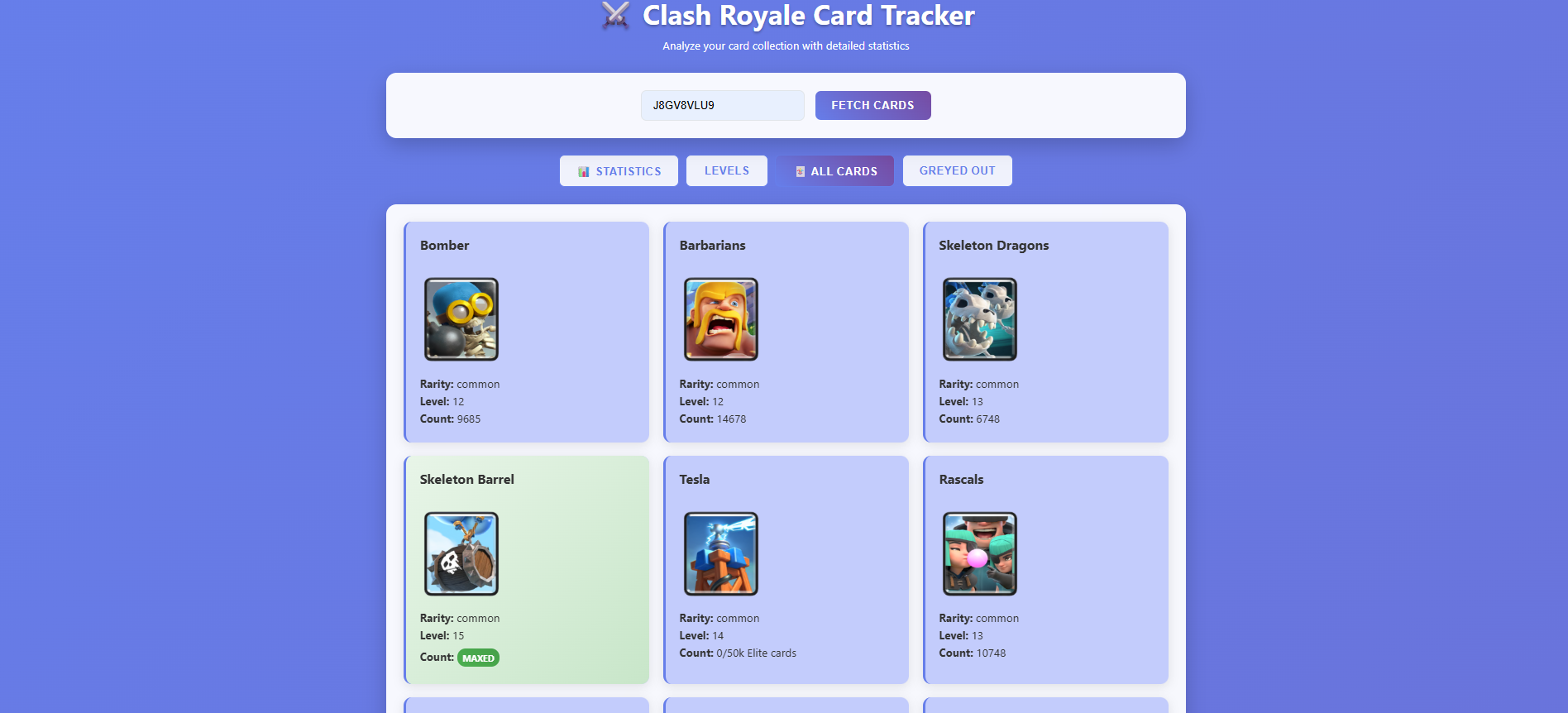 A website to track status and statistics of Clash Royale cards for faster progression